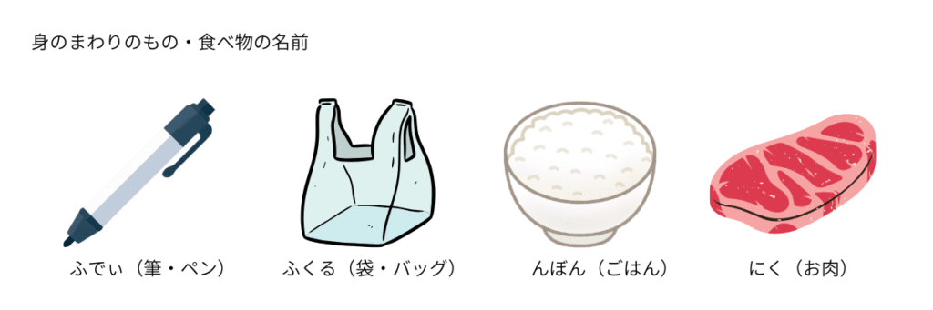 ものを指すとき、話し手の近くにあるものは「くり(これ)」、聞き手の近くにあるものは「うり(それ)」、話し手と聞き手どちらからも遠くにあるものは「あり・かり(あれ)」と言います。